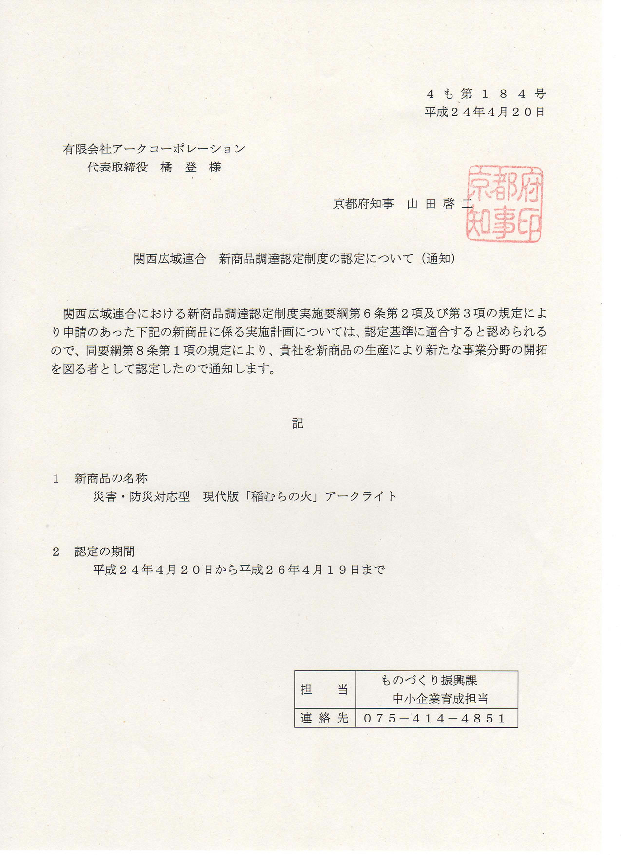 京都府からの認定書