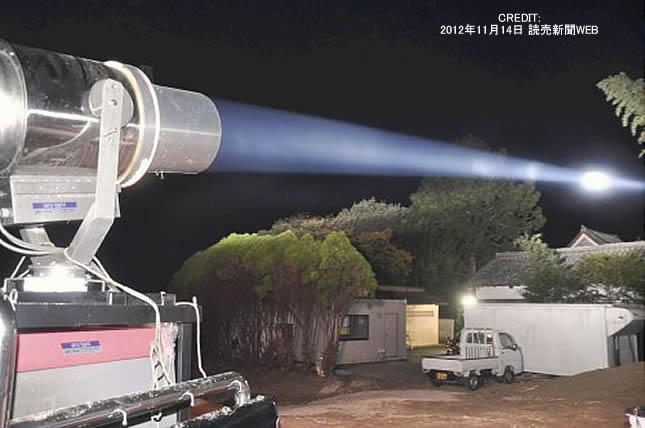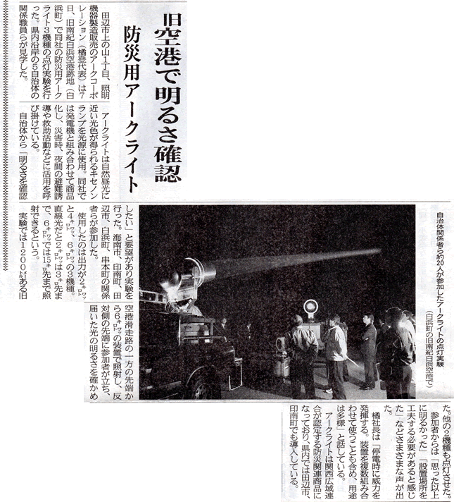 7日には白浜町の旧南紀白浜空港跡地で照射実験を行い、沿岸市町の防災担当者ら約30人が見学。串本町総務課の浜地弘貴副課長は「想像以上の明るさだ。遮蔽物がない高台に設置すれば夜でも避難しやすいのでは」と期待する。